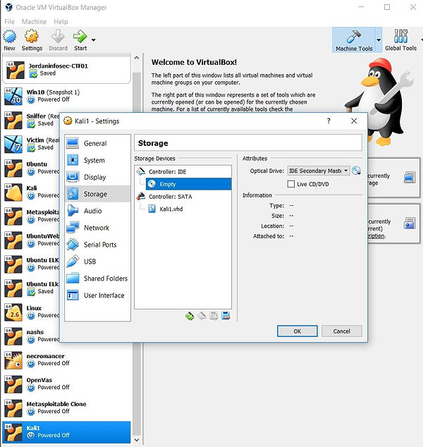At the top right of the Setting window, there is a small picture of a CD with a black downward facing arrow, click that and click Choose Virtual Optical Disk File. This is the file that you just downloaded from the Kali Linux Website.